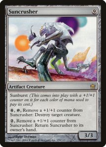 While ramping towards WUBRG, this deck features some serious artifact affinity and the multi-colored Mirrodin mechanic of Suburst. High-value cards such as Suncrusher or Etched Oracle are just super fun to play with the mana base that we have. Mixed with some of the counter generating and proliferating effects mentioned earlier, these cards can become pretty beefy very quickly.